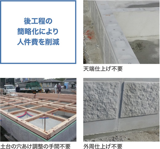基礎の天端・外周仕上げなどの工程が不要となり効率化を実現。配管も独立部分の間を通せるので自由なレイアウトが可能です。